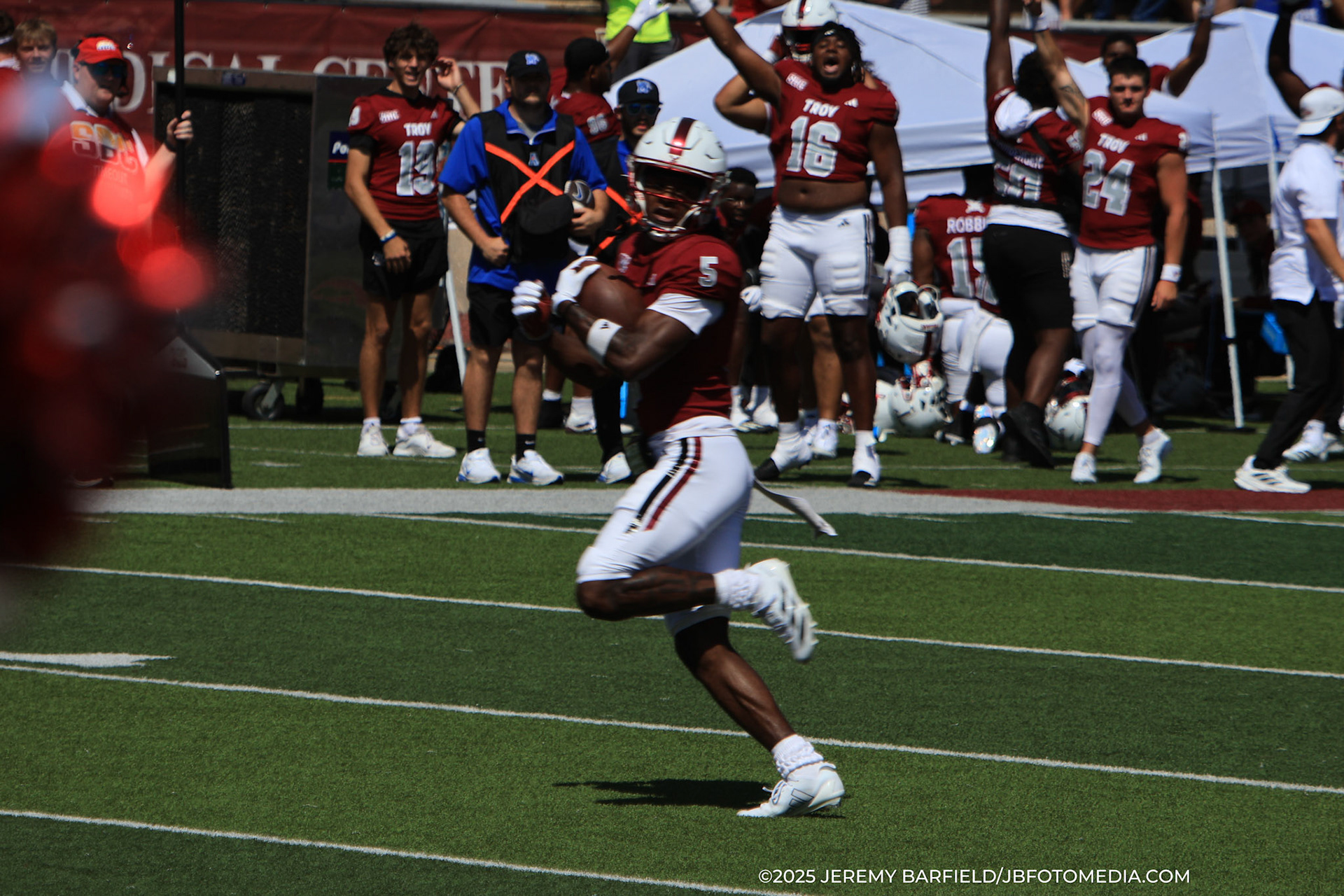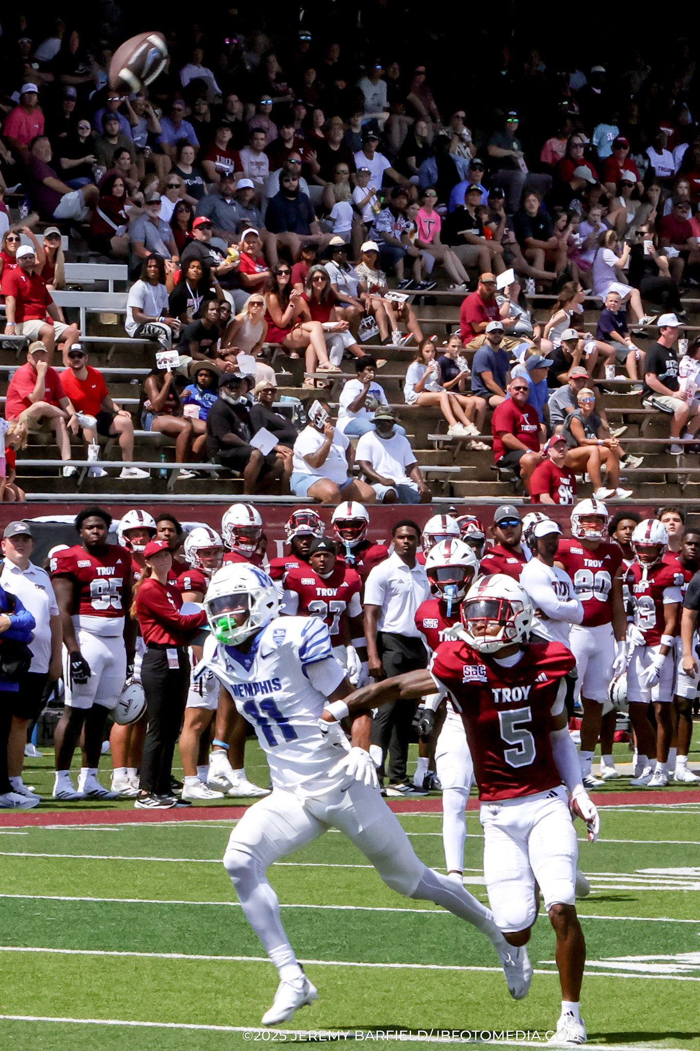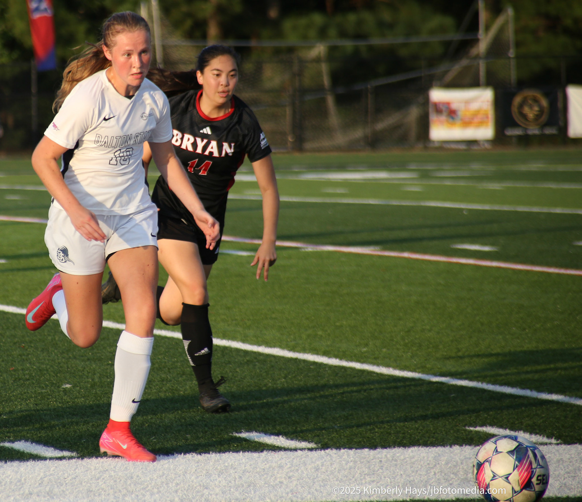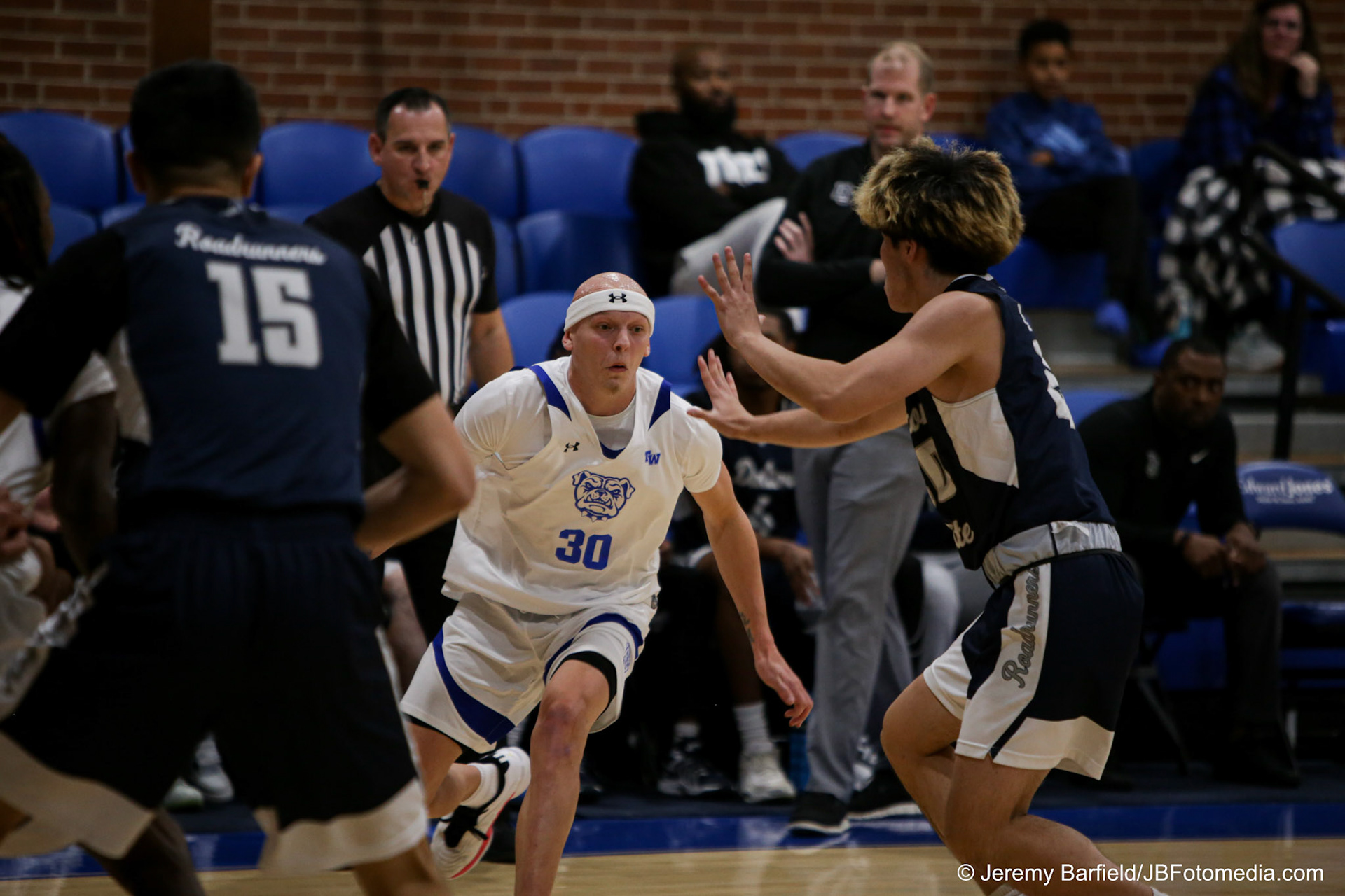DALTON, GA - Dec 2: Harry Morrice #14 of the University of the Cumberlands Patriots and Omarion Smith #2 of the Dalton State Roadrunners battle for the basketball at tip-off at Bandy Gymnasium in Dalton, GA. The Roadrunners defeated the #9 Patriots 88-80. (Photo by Jeremy Barfield/JBfotomedia.com)